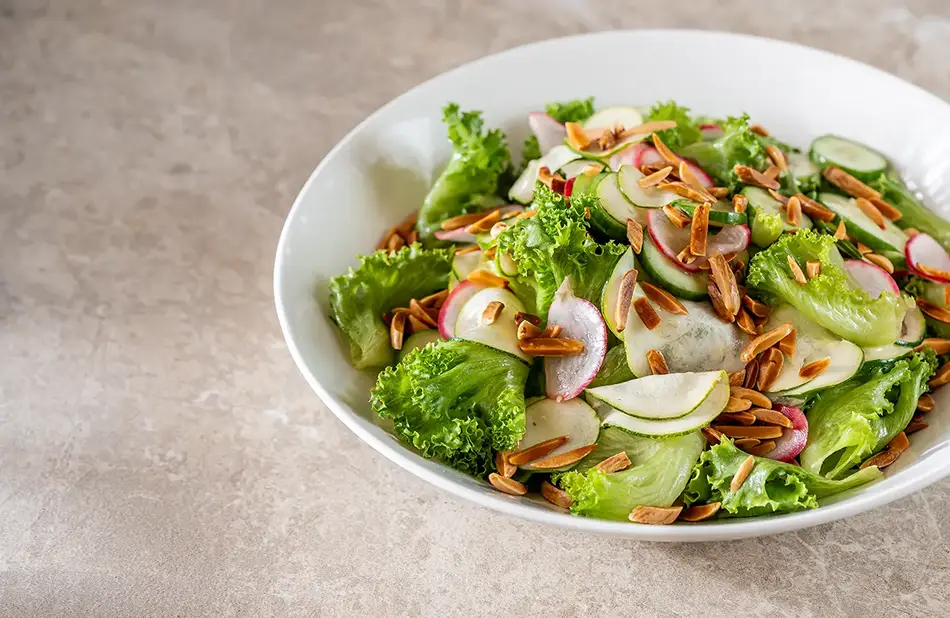 מלפפון בלאדי, צנונית, שומר, קולורבי, ענבים ירוקים, עלי בזיליקום נענע פטרוזיליה ורוקט, וינגרט לימון ועשבי תיבול.