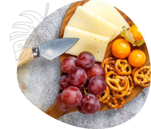 גרוייר, גאודה כמון, קוצ'טה פלפל שחור, לאבנה, טום מרלו, טבעות גבינת עזים, סנט מור, 2 סוגים ריבות משתנות, פרי העונה, בייגל ירושלמי, לחם אפריקאי ופוקאצ'ה.